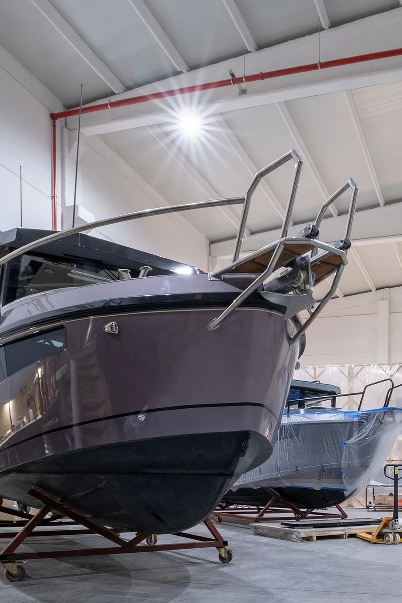 Then each boat is moved to the paint shop for the next step, which takes about 2 months. From the pre-sanding and preparation of all surfaces to create the perfect smooth base, to the careful application of the finishing coat, everything is handcrafted by our specialists. The use of premium marine-grade materials enhances the aesthetic appeal of the boat while giving an additional level of protection against saltwater corrosion and environmental exposures.